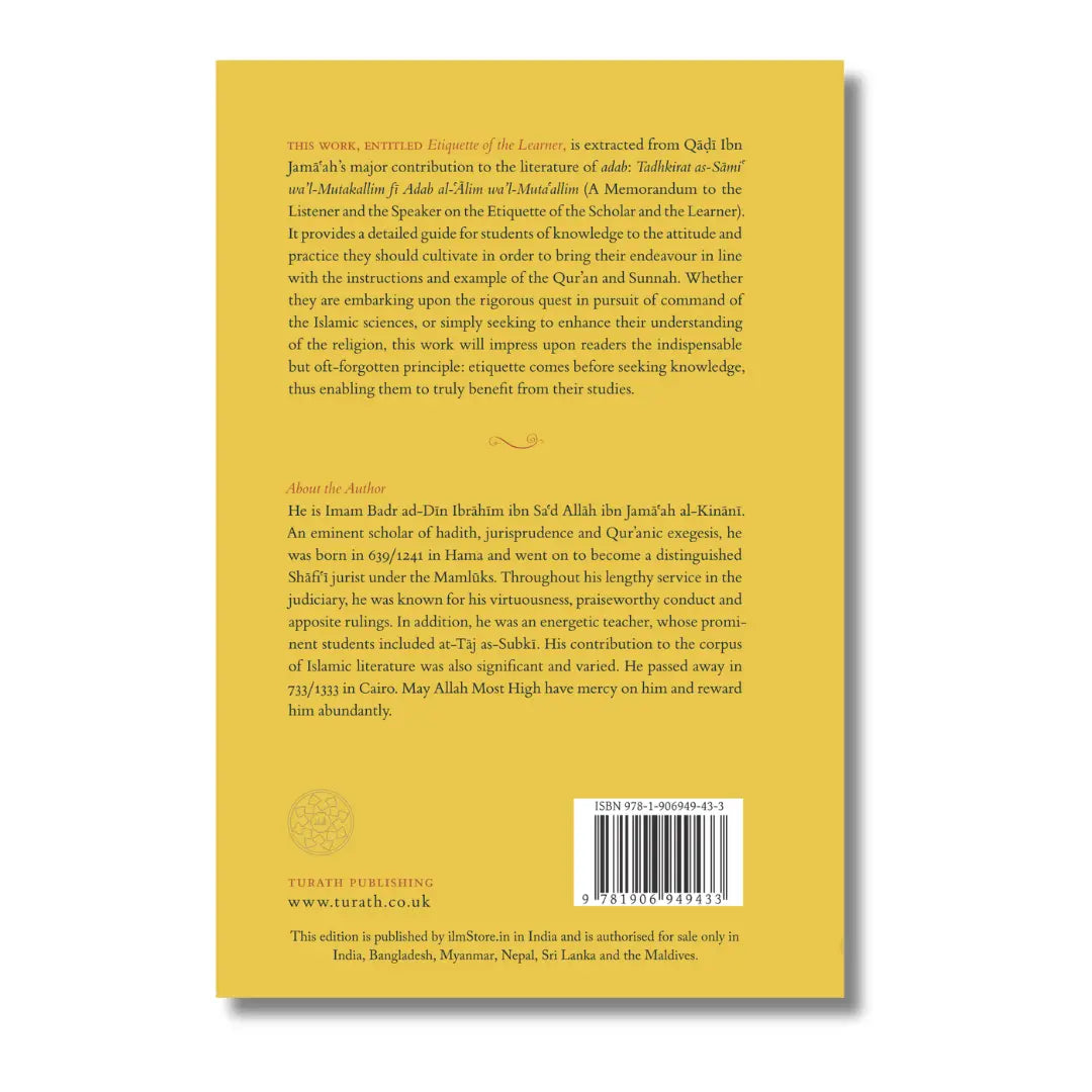 This work entitled Etiquette of the Learner, is extracted from Qadi Ibn Jama’ah’s major contribution to the literature of adab: Tadhkirat as-Sami wa’l-Mutakallim fi Adab al-‘Alim wa’l-Muta’allim (A Memorandum to the Listener and the Speaker on the Etiquette of the Scholar and the Learner). It provides a detailed guide for students of knowledge to the attitude and practice they should cultivate in order to bring their endeavour in line with the instructions and example of the Qur’an and Sunnah. Whether they are embarking upon the rigorous quest in pursuit of command of the Islamic sciences, or simply seeking to enhance their understanding of the religion, this work will impress upon readers the indispensable but oft-forgotten principle: etiquette comes before seeking knowledge, thus enabling them to truly benefit from their studies.