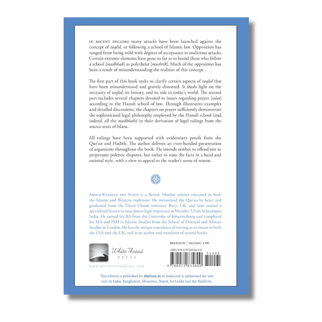 The first part of this book seeks to clarify certain aspects of taqlid that have been misunderstood and gravely distorted. It sheds light on the necessity of taqlid, its history, and its role in today’s world. The second part includes several chapters devoted to issues regarding salat [ritual prayer] according to the Hanafi school of law. Through illustrative examples and detailed discussions, the chapters on prayer sufficiently demonstrate the sophisticated legal philosophy employed by the Hanafi school (indeed all the madhhabs) in their derivation of legal rulings from the source texts of Islam.