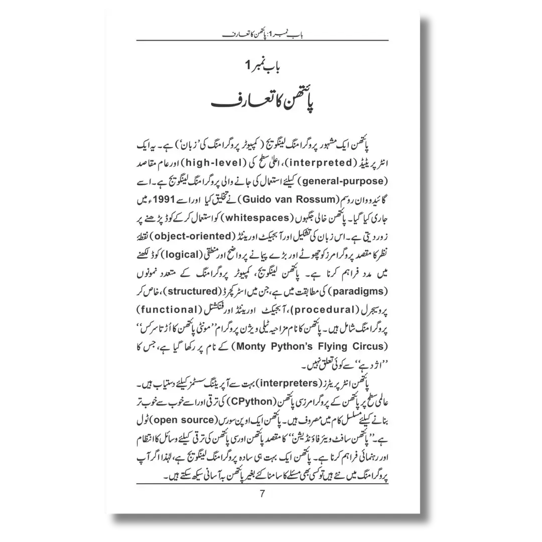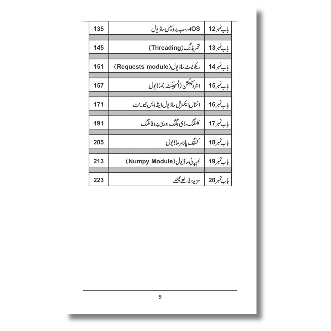 پائتھن کا شمار صف اوّل کی پروگرامنگ لینگویجزمیں ہوتا ہے، ڈیٹا سائنس ، آرٹیفیشل انٹیلی جینس ، مشین لرننگ ، سائبر سیکورٹی یا بلاک چین ، ہوں پائتھن میں مہارت آپکو ہر طرح کے کام کے قابل بنا دیتی ہے. آپ پائتھن سیکھ کر ایک با عزت روزگار حاصل کر سکتے ہیں اور فری لانسنگ کو ذریعہ آمدنی کے طور پر استعمال کر سکتے ہیں. یہ کتاب آپکو گھر بیٹھے پائتھن سیکھنے میں مدد دے گی اور آپکے کورسز پر لگنے والے پیسے اور وقت کی بچت کرے گی. اس کتاب میں آپ پائتھن کا تعارف اور مانگ، پائتھن کی انسٹالیشن اور انٹرفیس ، ڈیٹا ٹائپس ، کنٹرول سٹرکچرز ، آپریٹرز، فنکشنز، ایرر ہینڈلنگ اور رعایت، آبجیکٹ اورینٹڈ پروگرامنگ، فائل ہینڈلنگ ، فائلز کی ریڈنگ ، آپریٹنگ سسٹم ، سب پراسیس ، انٹروسپکشن اور ریکویسٹ ماڈیولز، تھریڈنگ ،SQL-Lite، ٹیسٹنگ ، ڈیبگنگ، پروفائلنگ، کونفیگ پارسر اور نمپپائی کے بارے میں جان سکیں گے. ٢٠ ابواب پر مشتمل اردو میں اپنی نوعیت کی یہ پہلی کتاب ہے اور اس سے اچھا پائتھن کا تعارف کہیں اور ملنا بہت مشکل ہے. آپکی آرا و تنقید کی منتظر ثناُ رشید